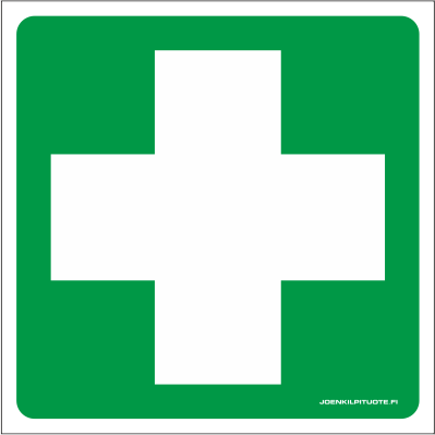 Jälkivalaiseva opastekilpi, jolla opastetaan ensiapupisteen sijainnista kiinteistössä.
