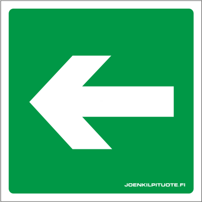 Jälkivalaiseva opastetarra, jolla ilmaistaan hätäpoistumisreitistä kiinteistössä.