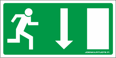 Jälkivalaiseva opastetarra, jolla ilmaistaan hätäpoistumisreitistä kiinteistössä.
